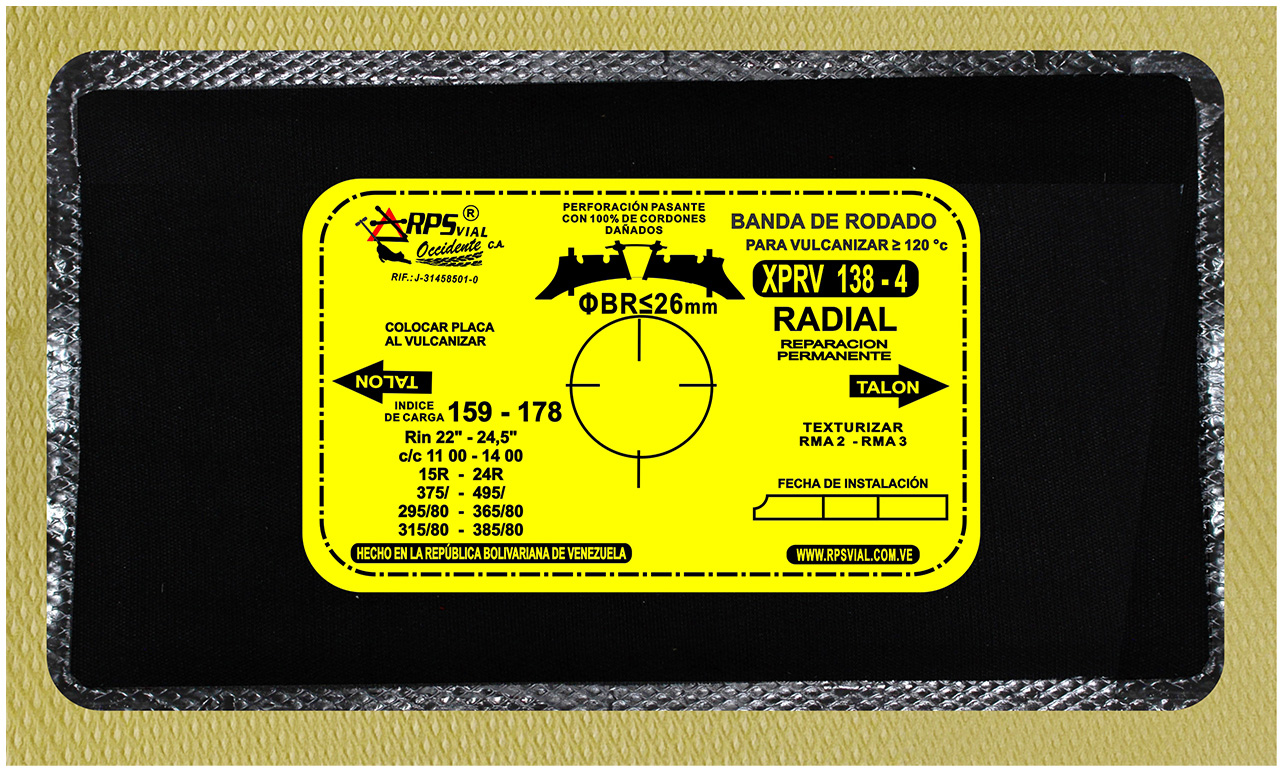 Aplicación permanente para vulcanizar cauchos radiales con perforaciones de 26 mm en banda de rodado respectivamente.